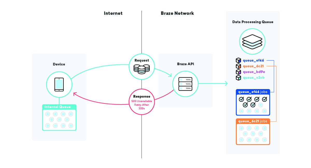 Когда наш SDK отправляется на отправку этих данных и по какой-либо причине терпит неудачу, SDK ставит в очередь повторную попытку, используя экспоненциальный алгоритм отсрочки, пока не добьется успеха. Эта стратегия сводит к минимуму влияние сбоев инфраструктуры или кода, поскольку устройства просто ставят в очередь свои собственные данные и отправляют их в Braze, когда все возвращается в онлайн.
