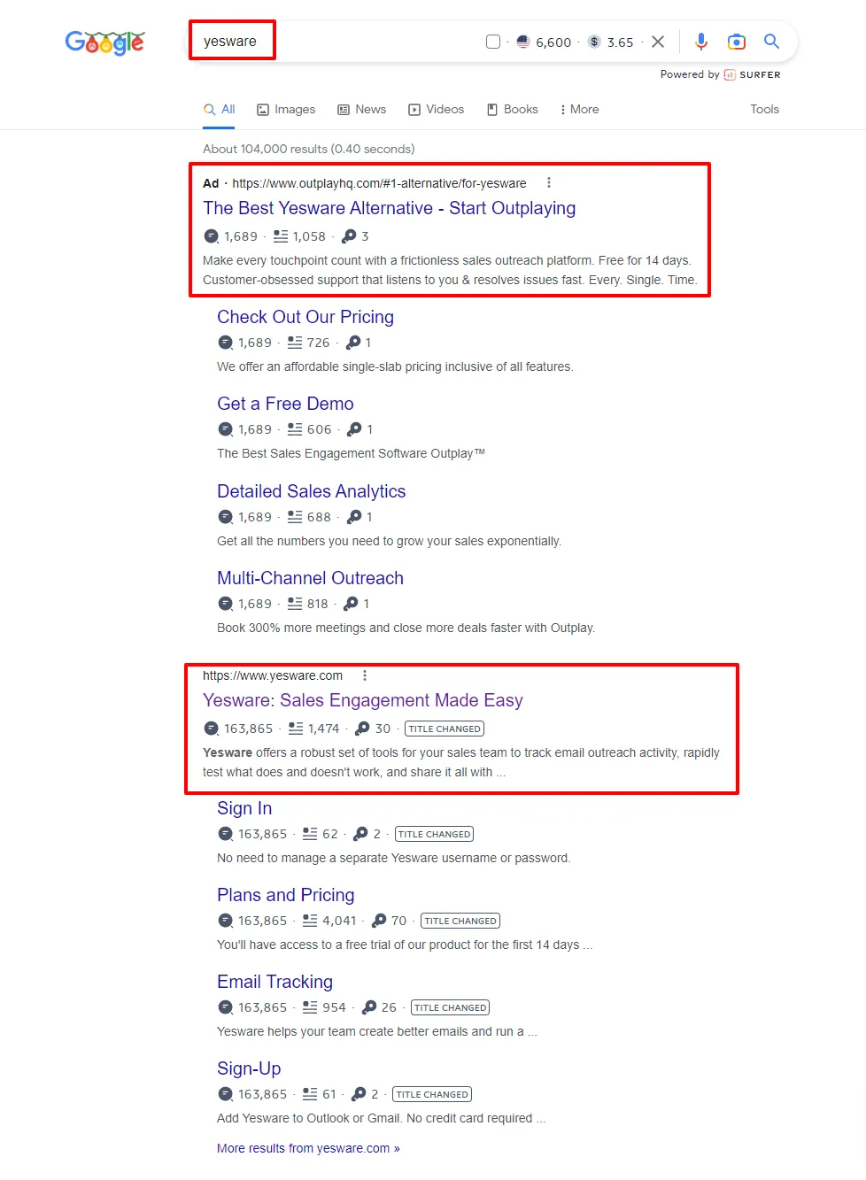 OutplayHQ ориентируется на людей, которые ищут своего конкурента Yesware. Вместо того, чтобы напрямую рекламировать свое имя, Outplay HQ предлагает назвать их «Лучшей альтернативой Yesware». Благодаря этой кампании они отбирают у Yesware значительную часть клиентов.