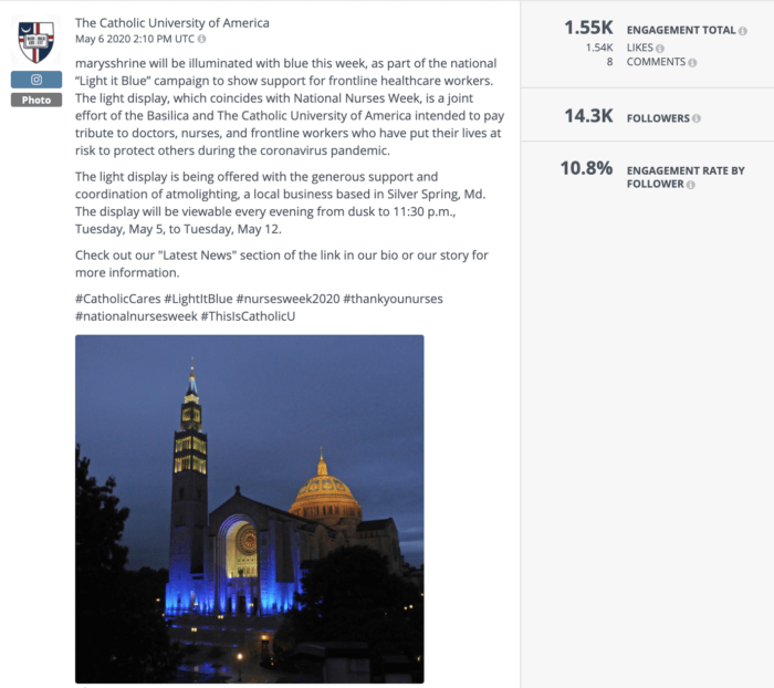Высшему образованию удалось сохранить уровень вовлеченности выше, чем в других отраслях, благодаря вдумчивым постам (а также студентам, родителям и выпускникам, жаждущим информации из своих колледжей и университетов). Этот простой пост в Instagram и действие Католического университета вдохновили их сообщество демонстрацией поддержки передовых медицинских работников и набрали 10,8% уровня вовлеченности, что более чем в 3 раза превышает текущий средний показатель высшего образования.