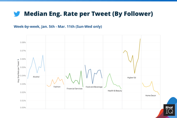 Показатели вовлеченности Высшего Эда аномальны в том смысле, что их самая высокая общая вовлеченность в 2020 году произошла с тех пор, как коронавирус действительно усилился несколько недель назад. Это увеличение имеет смысл, поскольку многие учащиеся, родители и выпускники обращаются к Твиттеру за последними новостями о закрытии школ. Стоит отметить, что Higher Ed неизменно демонстрирует высокую вовлеченность в Твиттере, и тот факт, что эти школы продолжают видеть высокую вовлеченность, поднимает средний показатель по отрасли на этом канале. Без Высшего образования общее снижение активности в Твиттере, вероятно, было бы более драматичным.