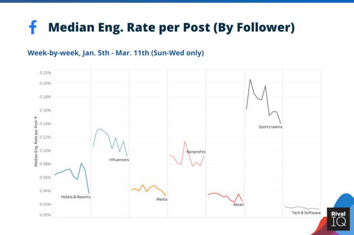 Отели и курорты и спортивные команды столкнулись с одним из самых резких относительных спадов на Facebook. Например, в начале года спортивные команды пользовались большим спросом благодаря подготовке к Суперкубку и мартовскому безумию, но в начале марта наблюдается резкий спад, когда начались отмены. Активность отелей и курортов сократилась вдвое, так как в начале марта началось все больше и больше предупреждений и запретов на поездки.