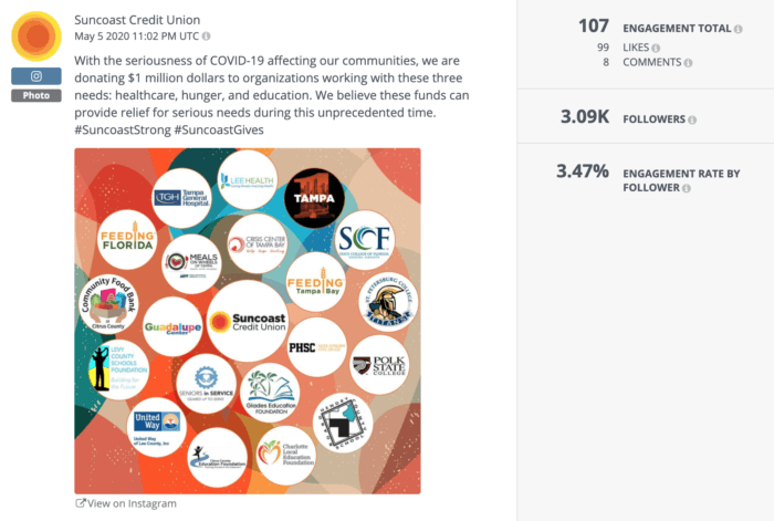 Suncoast Credit Union вкладывает свои деньги в дело, обещая денежную поддержку своему сообществу. Эта ощутимая демонстрация поддержки взбудоражила подписчиков в Instagram: уровень вовлеченности более чем в 6 раз превышает средний уровень вовлеченности для брендов финансовых услуг. Мы видели, как подобные обещания хорошо работают в различных отраслях, что говорит о том, что подписчики стремятся поддержать действия брендов.