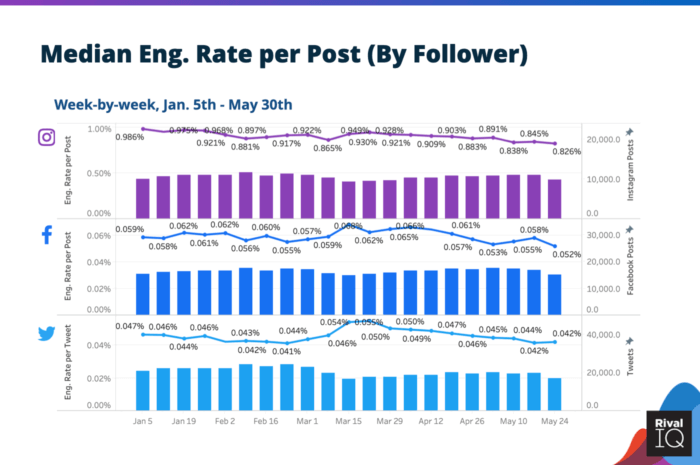 После первоначального падения в начале марта уровень вовлеченности достиг максимума 2020 года по всем трем каналам за последние несколько недель благодаря снижению частоты публикаций.