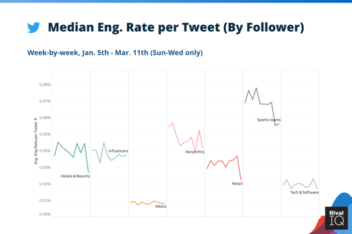 Итог: каждый канал и почти каждая отрасль столкнулись с падением вовлеченности по всем направлениям, но в настоящее время это снижение в Twitter более постепенное, чем в Facebook и Instagram. If you have timely, relevant content to share on Twitter with your followers, you can continue to expect engagement (at least for now).
