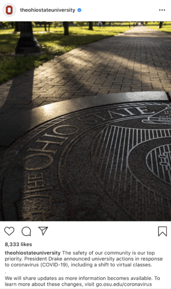 Университет штата Огайо вдумчиво и быстро сообщил подписчикам в Instagram о переходе на онлайн-занятия.