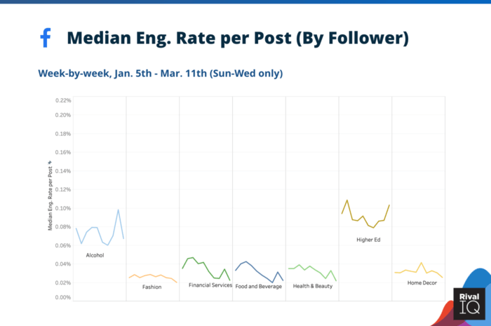 А Higher Ed помогает поддерживать средний показатель Facebook по отрасли, вернувшись на прошлой неделе к своему историческому максимуму 2020 года. «В частности, в сфере высшего образования уже наблюдается повышенная волатильность уровня вовлеченности. Это отличный пример того, что поможет брендам поддерживать вовлеченность: полезность. Поскольку школы задерживают и отменяют занятия, у заинтересованных сторон возникают вопросы, и они высказываются», — говорит Кит. С таким большим количеством сообщений о закрытии школ и переводе классов в онлайн, колледжи и университеты явно добиваются успеха в Facebook.