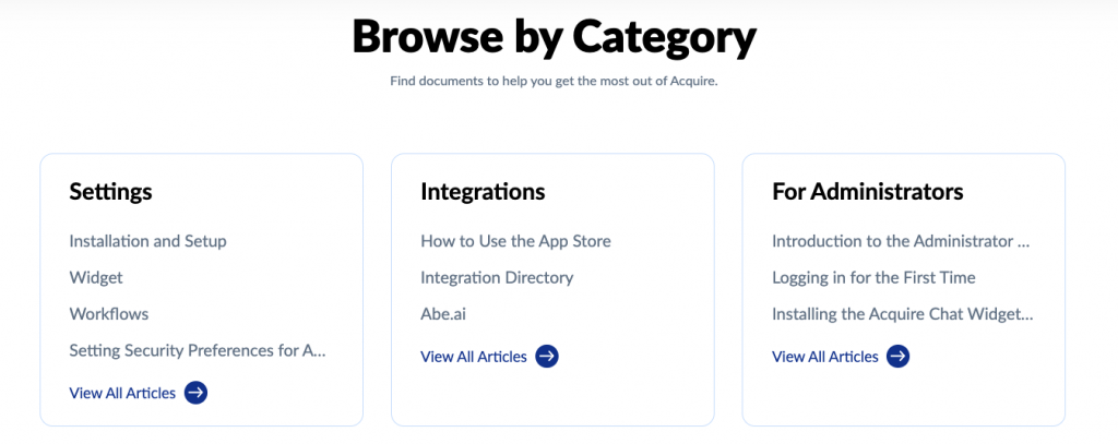 База знаний Acquire организована по различным категориям для более удобной навигации.