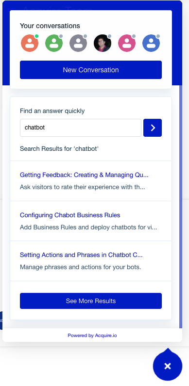 С помощью чата Acquire вы можете объединить альтернативы самообслуживания, такие как чат-боты и база знаний.