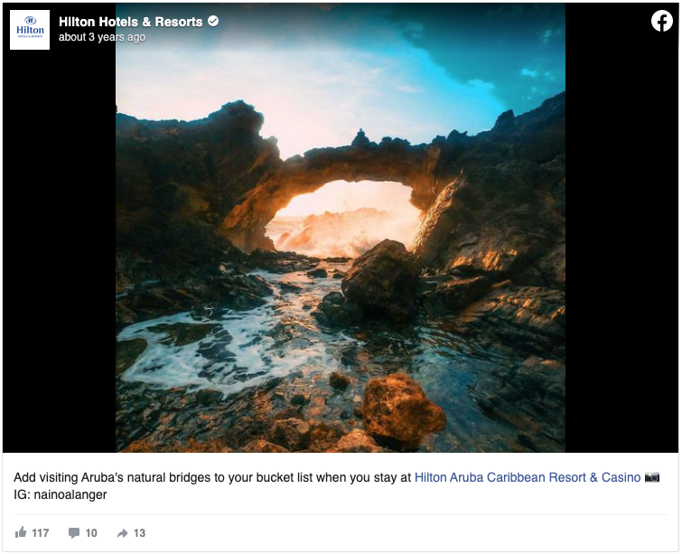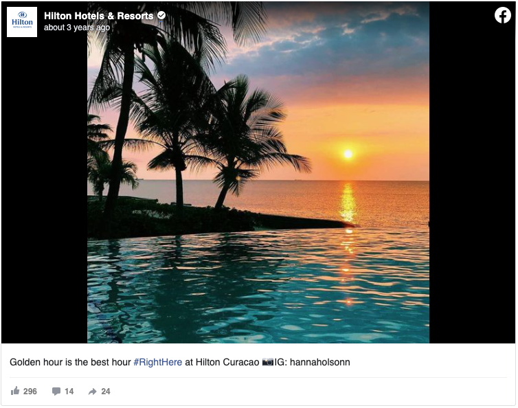 Hilton Hotels придерживается аналогичного подхода. Он регулярно публикует сообщения об удобствах, которыми могут наслаждаться гости, но делает еще один шаг, чтобы продемонстрировать «почему» путешествия. Hilton делится захватывающими фотографиями чудес природы и красивых закатов вокруг своих отелей, которые призваны вдохновить поклонников на планирование следующего отпуска.