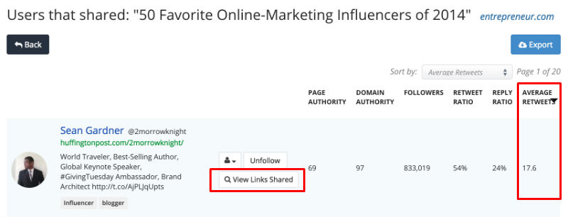 После этого отсортируйте результаты по среднему количеству ретвитов и типу контента, которым они делятся. Вам нужно найти лидеров мнений, которые имеют непосредственное отношение к вашей нише или имеют веские причины для ссылки или обмена вашим контентом.