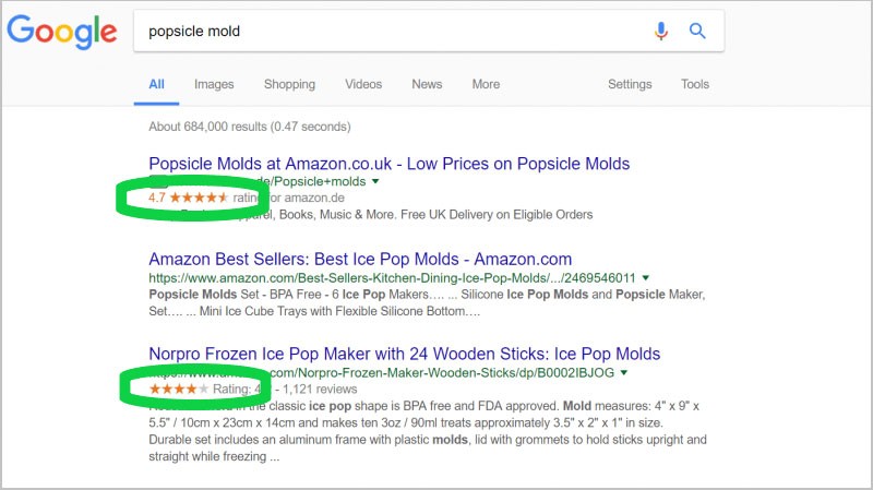 Благодаря доверию потребителей новые обзорные сайты постоянно доступны в Интернете. Эта доступность предоставляет потребителям больше возможностей для выражения своего опыта и мнений, чем когда-либо прежде. Формат обзора также становится все более заметным. Звездные рейтинги теперь доступны непосредственно рядом с обычными результатами поиска в платной рекламе AdWords и локальными результатами Google. Например: