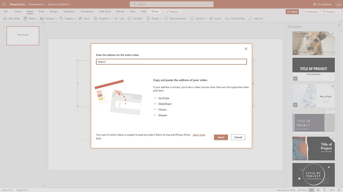 Как и в Keynote, вы можете вставлять видео с YouTube и Vimeo в свои презентации PowerPoint. Если у вас есть учетная запись Microsoft 365, вы также можете встраивать видео из Microsoft Stream.