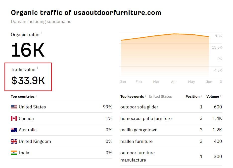 Если бы вы заняли третье место по ключевому слову «кресло для отдыха на открытом воздухе», вы могли бы рассчитывать на привлечение 1200 посетителей на свой сайт каждый месяц.