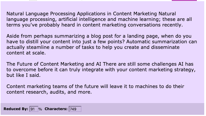 Автоматическое суммирование также потенциально может помочь вам индексировать контент или извлекать ключевые слова из ваших резюме, чтобы помечать и индексировать контент для будущих проверок, а также для поиска.