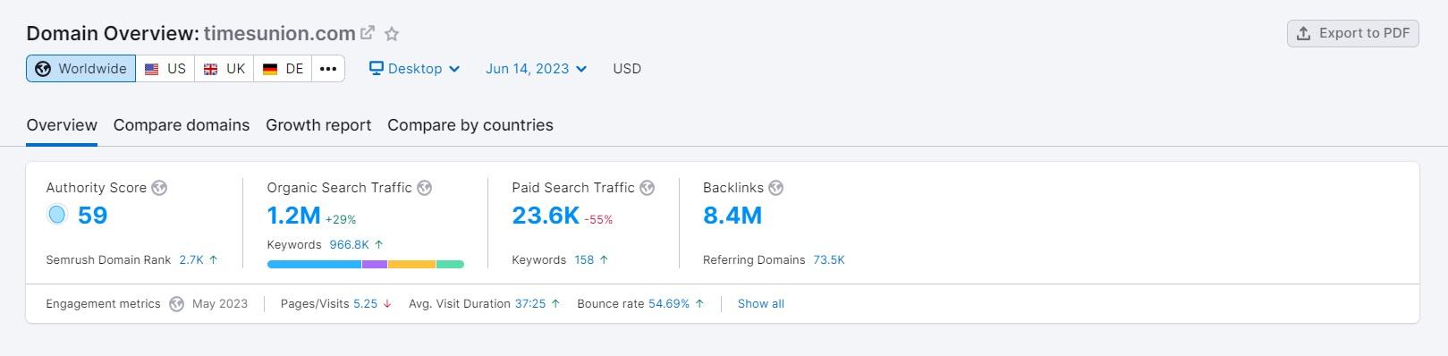 Глядя на рейтинг домена Times Union, мы видим, что он имеет высокий рейтинг авторитетности и множество обратных ссылок.