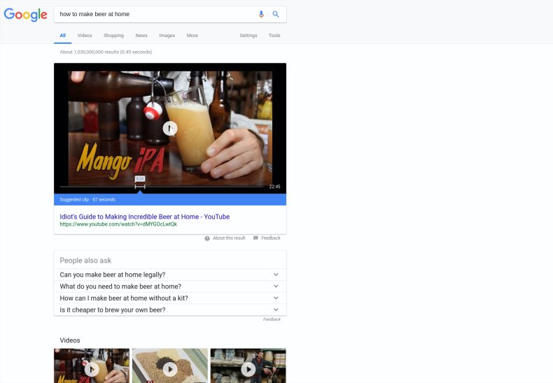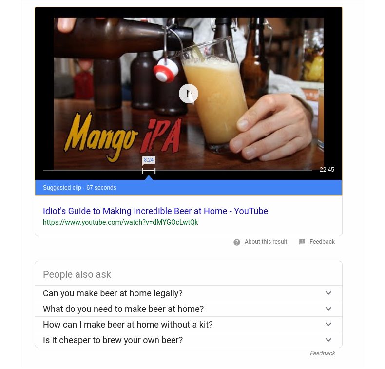 Первый фрагмент контента, который Google выбирает для показа своему пользователю на тему «как варить пиво дома», — это объясняющее видео с популярного канала YouTube «Brothers Green Eats».