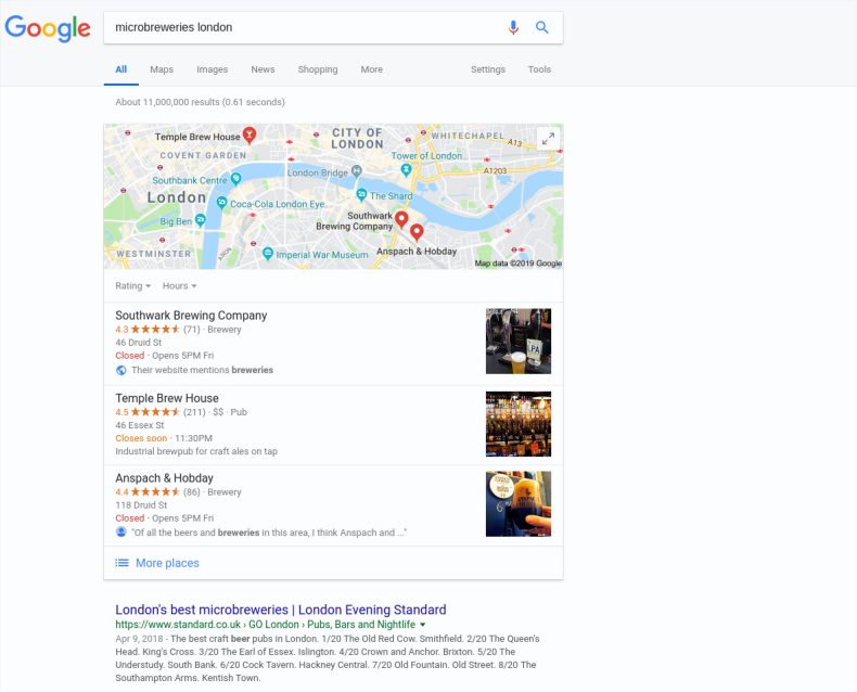Для нашего поискового запроса «микропивоварни в Лондоне» вы можете увидеть много примеров этого. Standard.co.uk был первым результатом.