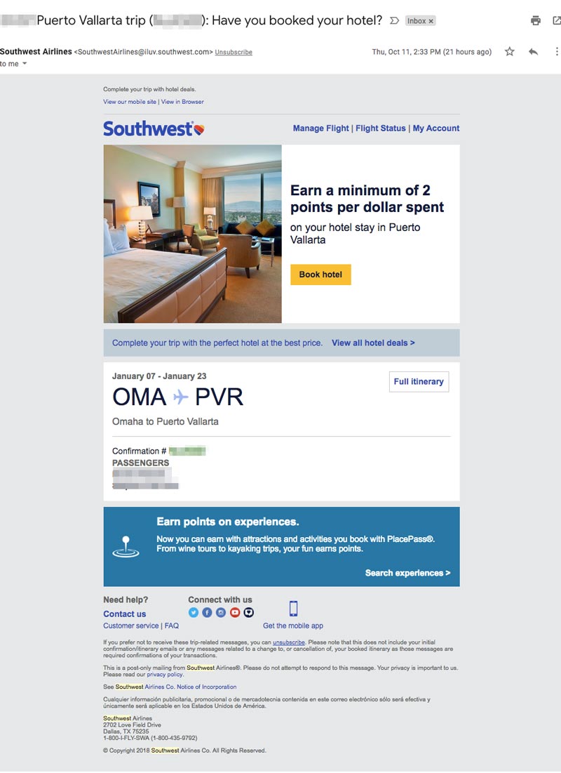 พวกเขาเริ่มต้นด้วยหัวเรื่องที่เป็นส่วนตัวสูง โดยใส่ตำแหน่งของการเดินทางและหมายเลขยืนยัน พวกเขาจับคู่กับคำถามที่กระตุ้นเตือนที่ดี: "คุณจองโรงแรมแล้วหรือยัง"