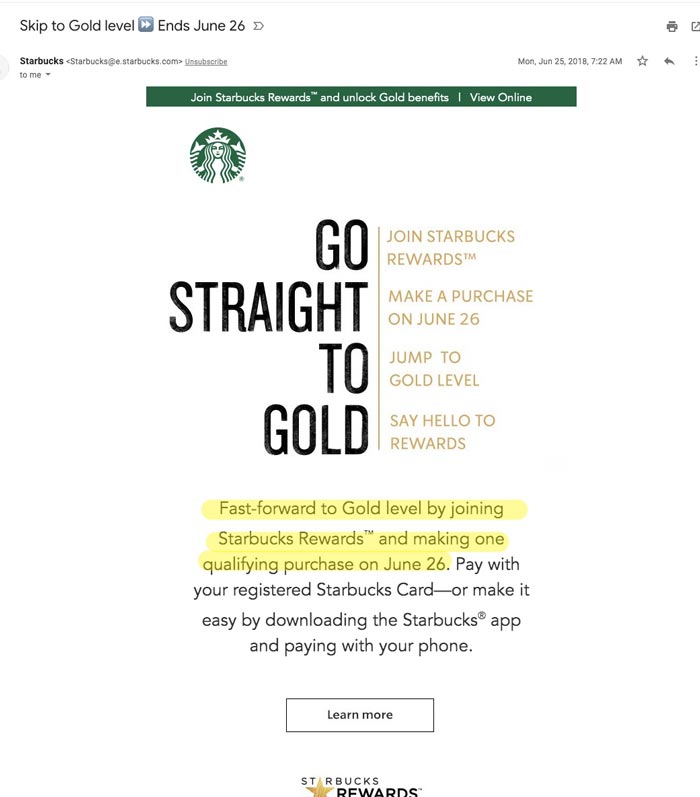 ที่นี่ พวกเขาเพียงเน้นถึงประโยชน์ของการเข้าร่วมโปรแกรม Rewards - ในกรณีนี้คือกาแฟฟรี สังเกตว่าทุกอย่างตั้งแต่ หัวเรื่องอีเมล ไปจนถึงรูปภาพช่วยเสริมประโยชน์จากส่วนกลางได้อย่างไร