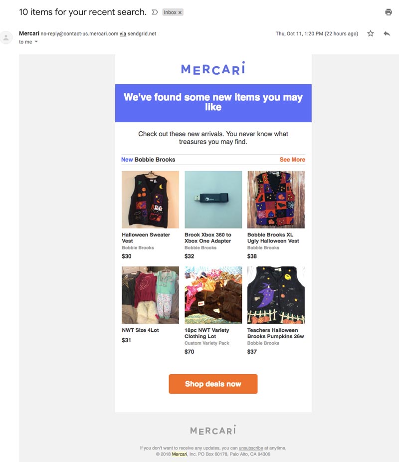 ภาพด้านบนแสดงให้เห็นว่า Mercari ทำสิ่งนี้อย่างสวยงาม พวกเขาเปิดด้วยหัวเรื่องที่น่าดึงดูด: "10 รายการจากการค้นหาล่าสุดของคุณ" และแทรกคำแนะนำแบบไดนามิกที่เชื่อมโยงกับแบรนด์ที่ถูกค้นหา