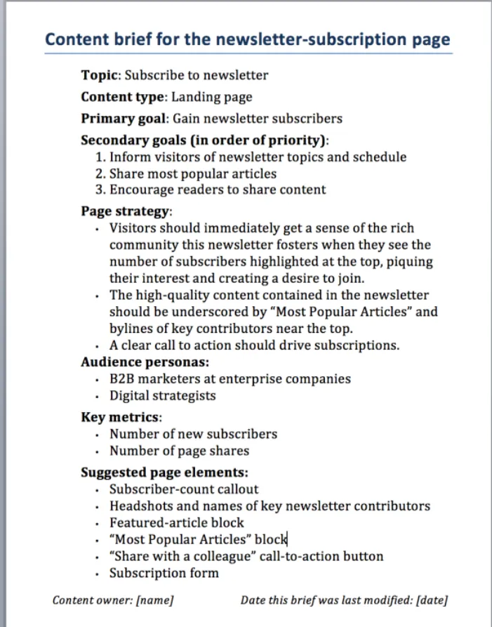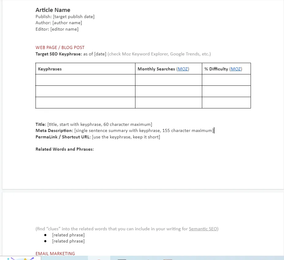 Portent มีเทมเพลตสั้นๆ ของเนื้อหาสามหน้าโดยละเอียดในรูปแบบ PDF ซึ่งแบ่งออกเป็นห้าส่วน ได้แก่ ข้อมูลสรุป การวิจัย SEO คำหลักเป้าหมาย ข้อมูลเมตา และโครงร่างโพสต์บล็อก