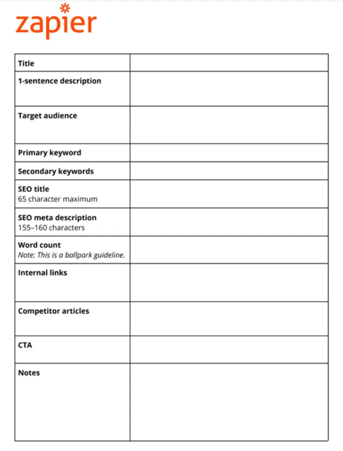 Zapier มีบรีฟเนื้อหาหน้าเดียวที่สะอาดหมดจด ซึ่งรวบรวมองค์ประกอบหลักที่จำเป็นในการร่างเนื้อหา อย่างไรก็ตาม ไม่มีโครงร่างที่อาจเป็นประโยชน์สำหรับผู้เขียน