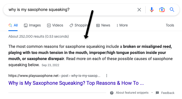 ตัวอย่างข้อมูลแนะนำและการจัดอันดับกล่องคำตอบ (เช่นที่แสดงในส่วนด้านล่าง) ได้รับเปอร์เซ็นต์การคลิกมากที่สุด เช่นเดียวกับการจัดอันดับอันดับแรกอื่นๆ ในความเป็นจริง ตัวอย่างข้อมูลเด่นเห็นอัตราการคลิกผ่านเฉลี่ย 20.36% เทียบกับ 13.74% สำหรับผลลัพธ์ "ผู้คนยังถาม" และ 8.46% สำหรับผลลัพธ์มาตรฐานแรกด้านล่าง "ผู้คนถามด้วย" ตามข้อมูลของ AWR) นอกจากนี้ยังสร้างความไว้วางใจให้กับแบรนด์ของคุณด้วยการให้คำตอบที่มีความรู้สำหรับคำถามของลูกค้าที่มีศักยภาพ