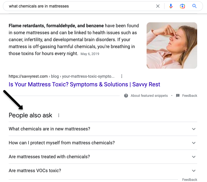 ตัวอย่างเช่น ผู้ใช้อาจค้นหา "ที่นอนปลอดสารพิษ" หรืออาจใช้วลีเช่น "ที่นอนที่ไม่มีสารหน่วงการติดไฟ" คุณอาจพบว่าผู้คนถามว่า “มีสารเคมีอะไรบ้างในที่นอน” คุณจะใช้ข้อมูลนี้เพื่อจัดโครงสร้างบทความของคุณและจัดลำดับความสำคัญของคำถาม/คำหลักที่มีปริมาณมากที่สุด (กล่าวคือ จัดลำดับความสำคัญของคำหลัก/คำถามที่มีจำนวนการค้นหามากที่สุด)