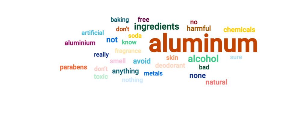 ความสนใจที่เพิ่มขึ้นในผลิตภัณฑ์ระงับกลิ่นกายที่สะอาดแสดงให้เห็นว่าผู้บริโภคมีความกังวลมากขึ้นเกี่ยวกับการใช้ผลิตภัณฑ์ที่ไม่มีสารเคมีที่อาจเป็นอันตรายต่อสุขภาพของพวกเขา พวกเขายังรู้ด้วยว่าพวกเขาต้องการอะไร หรือมากกว่าสิ่งที่พวกเขาไม่ต้องการ เมื่อพูดถึงส่วนผสมบางอย่าง ส่วนผสมที่ผู้ตอบแบบสอบถามของเราต้องการหลีกเลี่ยงมากที่สุดคืออะลูมิเนียม ในขณะที่แอลกอฮอล์ยังได้รับการจัดอันดับสูงในคำตอบของผู้ตอบแบบสอบถามด้วย เป็นเรื่องที่น่าสนใจที่จะได้เห็นความตระหนักของผู้บริโภคในส่วนผสมที่เป็นอันตรายหรือไม่ดีช่วงต่างๆ นี้