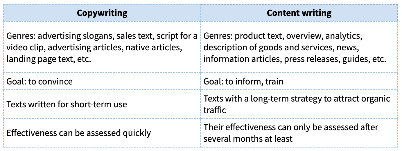 เมื่อพูดถึงการเขียนข้อความเชิงพาณิชย์ ไม่ว่าจะเป็นคำอธิบายสำหรับเว็บไซต์หรือบทความที่จะเผยแพร่ในแหล่งข้อมูลของบุคคลที่สาม มีผู้เชี่ยวชาญอยู่ 2 ประเภท ได้แก่ นักเขียนคำโฆษณาและนักเขียนเนื้อหา สิ่งสำคัญคือต้องแยกแนวคิดทั้งสองออกจากกัน เพราะงานและแนวทางต่างกันโดยสิ้นเชิง และแน่นอน พวกเขาให้ผลลัพธ์ที่แตกต่างกัน