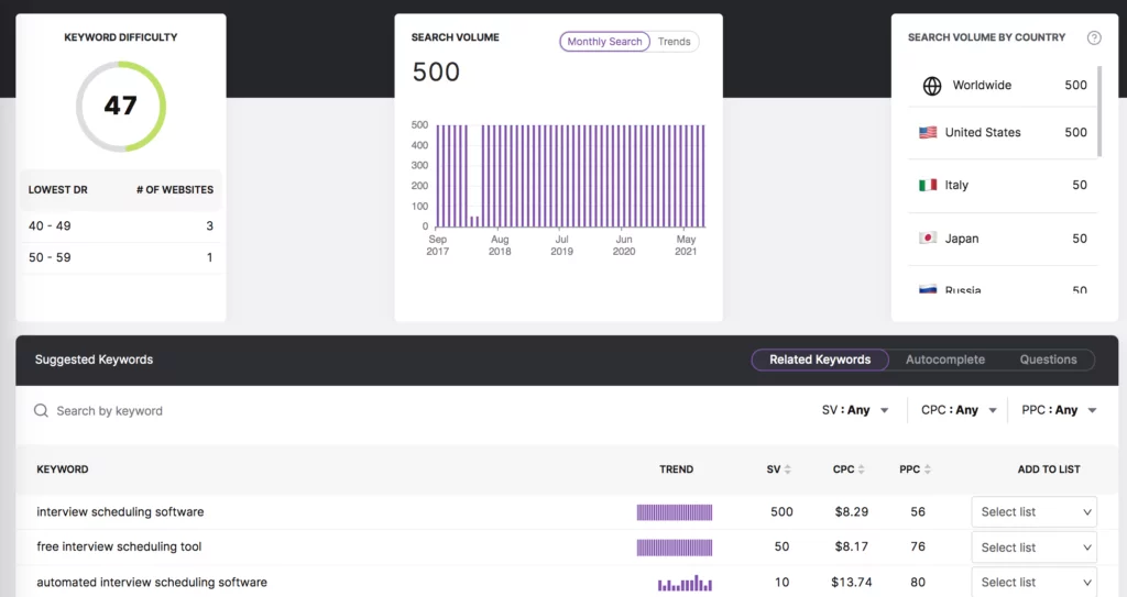 - ใช้เครื่องมือ LinkGraph ซึ่งเป็นเครื่องมือวิจัยคำหลักเพื่อดูว่าคำหลักแบบหางยาว คำถาม และการเติมข้อความอัตโนมัติใดที่ผู้คนกำลังค้นหา