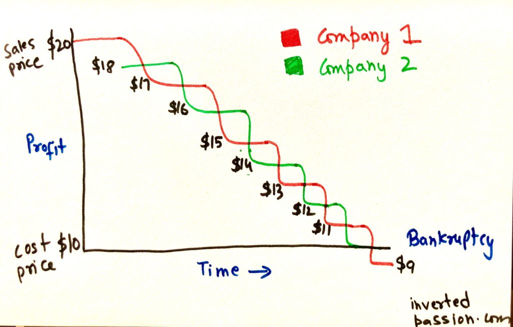 ทีมผู้บริหารของบริษัทดังกล่าวไม่ได้โง่เขลา เพียงแต่บริษัทดังกล่าวถูกขังอยู่ในสภาพแวดล้อมการแข่งขันที่ไม่เอื้ออำนวย และพวกเขาไม่มีความคิดสร้างสรรค์มากพอที่จะหลุดพ้นจากมัน หากคุณเคยเรียนวิชากลยุทธ์ คุณอาจเคยเจอแบบจำลองกำลังห้าประการของ Porter ที่แสดงให้เห็นว่าเหตุใด ผลกำไรจึงมีแนวโน้มที่จะหายไป (ในขณะที่รายได้ไม่ได้รับผลกระทบ) ในการต่อสู้แบบตัวต่อตัวระหว่างคู่แข่ง ลูกค้า (ไม่ใช่ผู้ถือหุ้น) ก็จบลงด้วยความสนุกสนาน