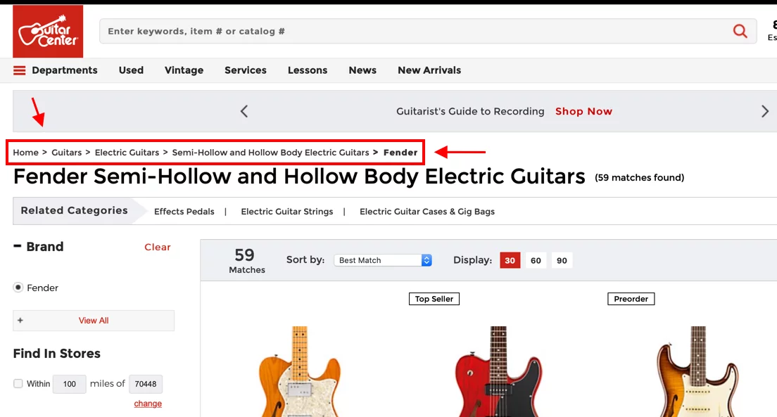 การนำทางหลักของ Guitar Center ไม่แสดงหรือลิงก์ภายในไปยังหน้าใดๆ ที่อยู่ใต้หมวดหมู่ "กีตาร์ไฟฟ้า" อย่างไรก็ตาม ยังมีหมวดหมู่ย่อยของผลิตภัณฑ์เพิ่มเติมภายในหมวดหมู่ผลิตภัณฑ์กีตาร์ไฟฟ้า เพื่อปรับปรุงความสามารถในการใช้งานและการค้นพบหน้าหมวดหมู่ย่อยเพิ่มเติมเหล่านี้ได้เพิ่มการนำทางเบรดครัมบ์ (เน้นด้วยสีแดงด้านล่าง)