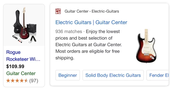 เมื่อคุณกำหนดหมวดหมู่ผลิตภัณฑ์และหมวดหมู่ย่อยได้แล้ว ให้พิจารณาสร้างหน้า Landing Page ที่เกี่ยวข้องสำหรับแต่ละหมวดหมู่และ/หรือหมวดหมู่ย่อย การศึกษาล่าสุดแสดงให้เห็นว่าไซต์ที่เพิ่มหน้า Landing Page จาก 10 เป็น 15 หน้าจะมีโอกาสในการขายเพิ่มขึ้น 55% หน้าเหล่านี้สามารถใช้กำหนดเป้าหมายคำหลักที่กว้างกว่าคำหลักเฉพาะผลิตภัณฑ์ของคุณ ตัวอย่างเช่น หน้านี้เกี่ยวกับ Guitar Center สำหรับกีตาร์ไฟฟ้า: