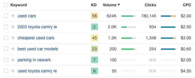 ในตัวอย่างด้านล่าง เราจะเห็นว่าการค้นหาที่เฉพาะเจาะจงมากขึ้นสามารถมีราคาต่อหนึ่งคลิกที่สูงขึ้นได้อย่างไร นี่เป็นตัวบ่งชี้ตลาดว่าคำนี้มีการแปลงที่สูงขึ้น นอกจากนี้ คุณยังอาจสังเกตเห็นว่ามีปริมาณการค้นหาน้อยลงสำหรับคำหลักแบบหางยาวหรือเฉพาะเจาะจง การค้นหาแบบกว้างมีปริมาณการค้นหาที่สูงกว่าเนื่องจากมีเหตุผลที่หลากหลายกว่ามากที่สามารถดำเนินการค้นหาเหล่านั้นได้ การค้นหาเฉพาะมีเจตนาที่ชัดเจนกว่ามาก