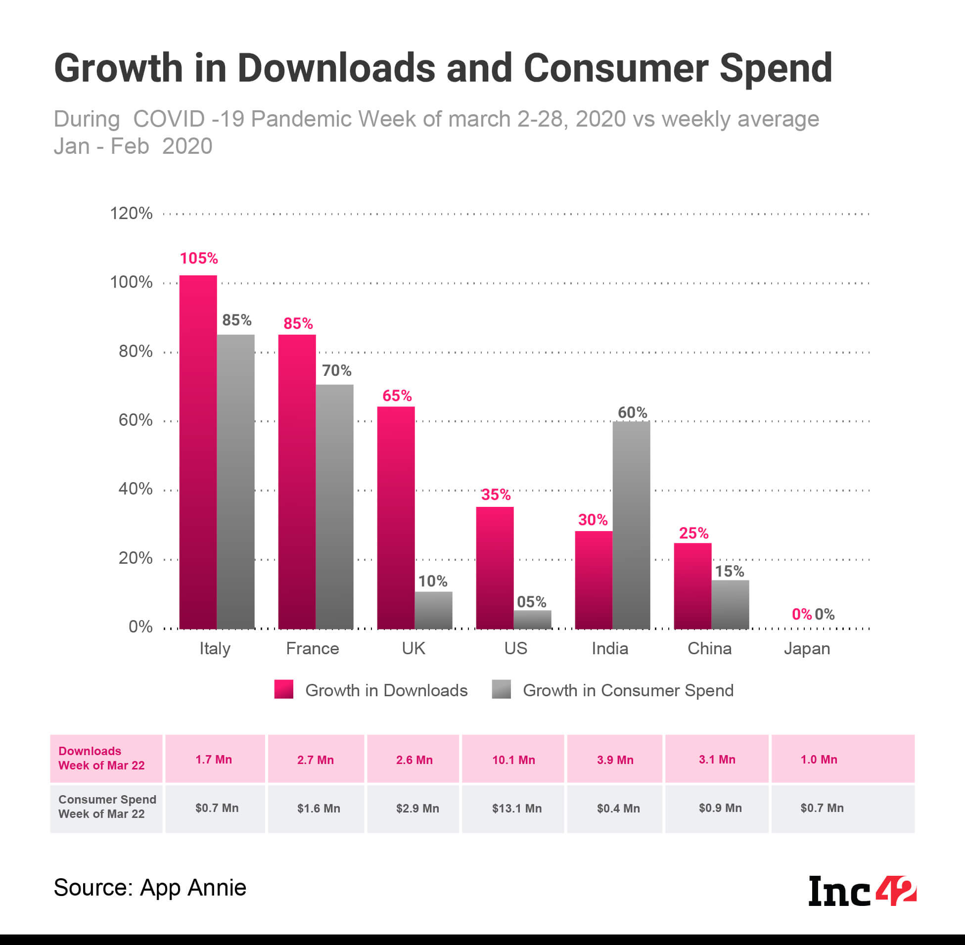 รายงานระบุว่ามีการดาวน์โหลดแอปฟิตเนสในอินเดียเพิ่มขึ้น 30% ในช่วงสัปดาห์ที่ 22-28 มีนาคม เมื่อเทียบกับการดาวน์โหลดเฉลี่ยรายสัปดาห์ในเดือนมกราคมและกุมภาพันธ์ ในช่วงเวลาเดียวกัน การใช้จ่ายของผู้บริโภคในแอพฟิตเนสเพิ่มขึ้น 60% ในอินเดีย ซึ่งมากกว่าค่าเฉลี่ยทั่วโลกที่ 50%