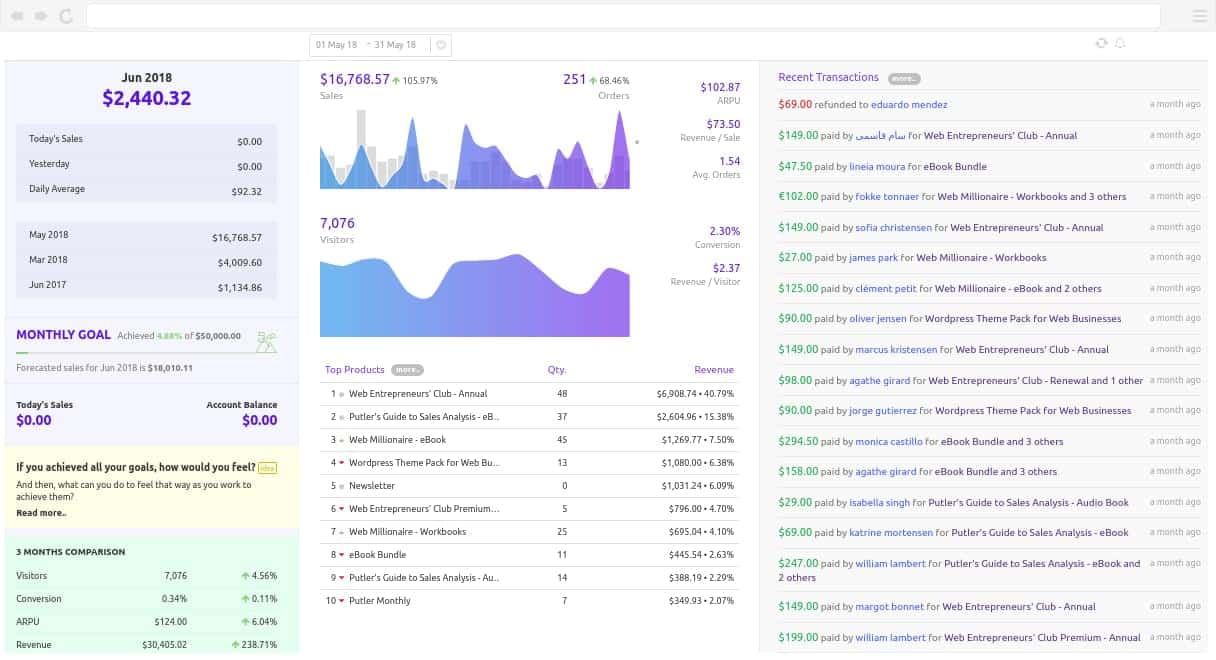 - แดชบอร์ดที่ครอบคลุม: Putler มี 9 แดชบอร์ด แดชบอร์ดเหล่านี้ได้แก่ แดชบอร์ดหลัก แดชบอร์ดการขาย แดชบอร์ดลูกค้า แดชบอร์ดธุรกรรม แดชบอร์ดกลุ่มเป้าหมาย แดชบอร์ดข้อมูลเชิงลึก แดชบอร์ดผลิตภัณฑ์ และแดชบอร์ดการสมัครใช้งาน
