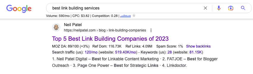 ในภาพหน้าจอด้านบน คุณจะเห็น Neil Patel ตั้งชื่อเราว่า 'ดีที่สุดสำหรับ Blogger Outreach' ในบล็อกที่เขาได้รับการจัดอันดับเป็น 'บริการสร้างลิงก์ที่ดีที่สุด' เป็นอันดับแรก ที่นี่ เป้าหมายสุดท้ายของการทำ SEO แบบกาฝากสามารถทำได้โดยปราศจากยุงแม้แต่ตัวเดียว!
