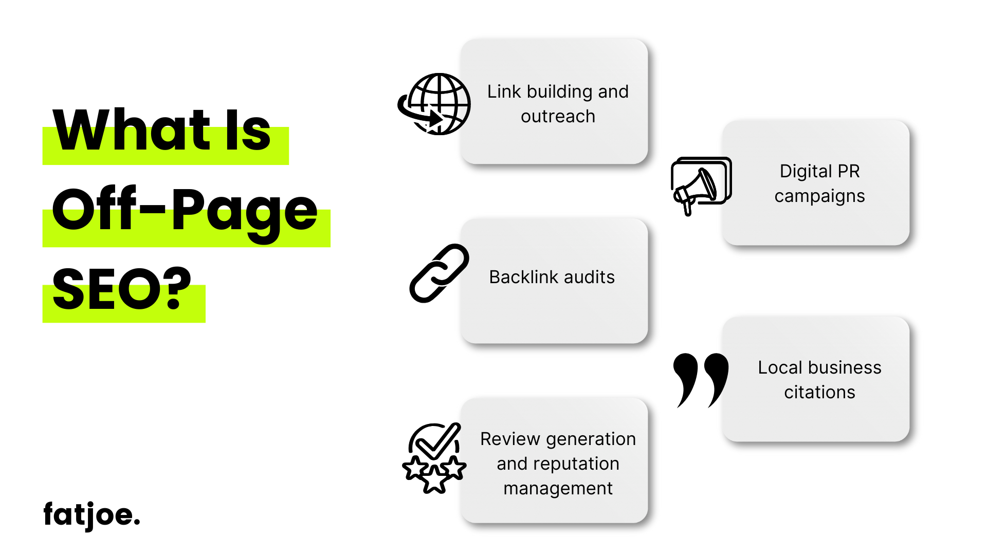 เสาหลักที่สามของ SEO ประเภทหลักคือ SEO นอกหน้า Off-page SEO เป็นความสามารถพิเศษสำหรับเราที่ FATJOE เนื่องจากมุ่งเน้นไปที่การรักษาความปลอดภัยลิงก์ย้อนกลับคุณภาพสูงเป็นหลัก