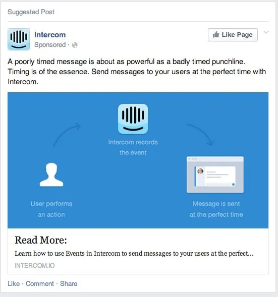 Birçok SaaS işletmesi gibi Intercom da iyi araştırılmış, derinlemesine içeriğiyle kendini pazarlamayı tercih ediyor. Bunu hedefli reklamlar aracılığıyla etkili bir şekilde yaparlar. Intercom'un aşağıdaki Facebook reklamına bir göz atın.