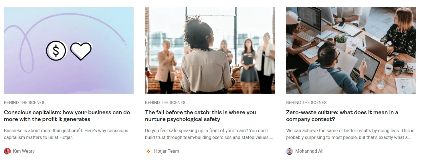 Meraklı beyinlerini blogu ile tatmin ederek izleyicilerini yakınlarına çekmişlerdir . Hotjar, iniş ve çıkışlarını vurgulayan harika bir "perde arkası" hikaye koleksiyonuyla, izleyicileriyle insani bir bağ kurdu.