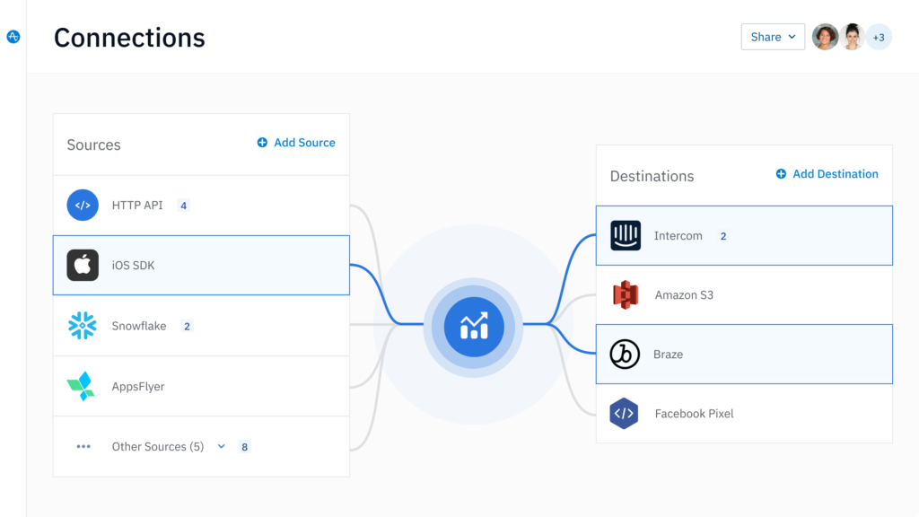 Veri yönetimi yazılımı, kuruluşunuzun veri kataloğuna erişimi ve görünürlüğü artırarak ürün, pazarlama ve finans gibi ekipler arasında veri paylaşımını kolaylaştırır. Herkes istediği verileri hızla bulabilir ve veri analistlerinin manuel ve zaman alıcı SQL sorguları yazma ihtiyacını ortadan kaldırır. DMS, kuruluşunuz genelinde üretkenliği artıran veri silolarını bozar. Örneğin, Amplitude Müşteri Veri Platformu (CDP) ile ekiplerin bağlantı kurması ve veri kaynakları ve hedefleri oluşturması daha kolay.