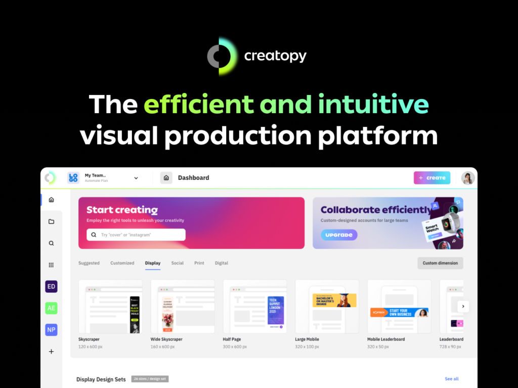 Etkili ve sezgisel bir görsel prodüksiyon platformu olan Creatopy, iletişimciler için iyi hazırlanmış bir deneyim sunarak bireylerin ve ekiplerin çok kanallı yaratıcı ortamlar için ilgi çekici reklam görselleri oluşturmasına olanak tanır. Creatopy, iletişimcilere ve markalara görsel içeriği düzenli ve marka üzerinde tutmak için gerekli tüm araçları sağlar. Anında tasarım oluşturma, afiş oluşturma veya yaratıcı iş akışlarını iyileştirme için erişilebilir bir çözüm arıyorsanız, Creatopy tasarım işlerinize her aşamada yardımcı olabilir."