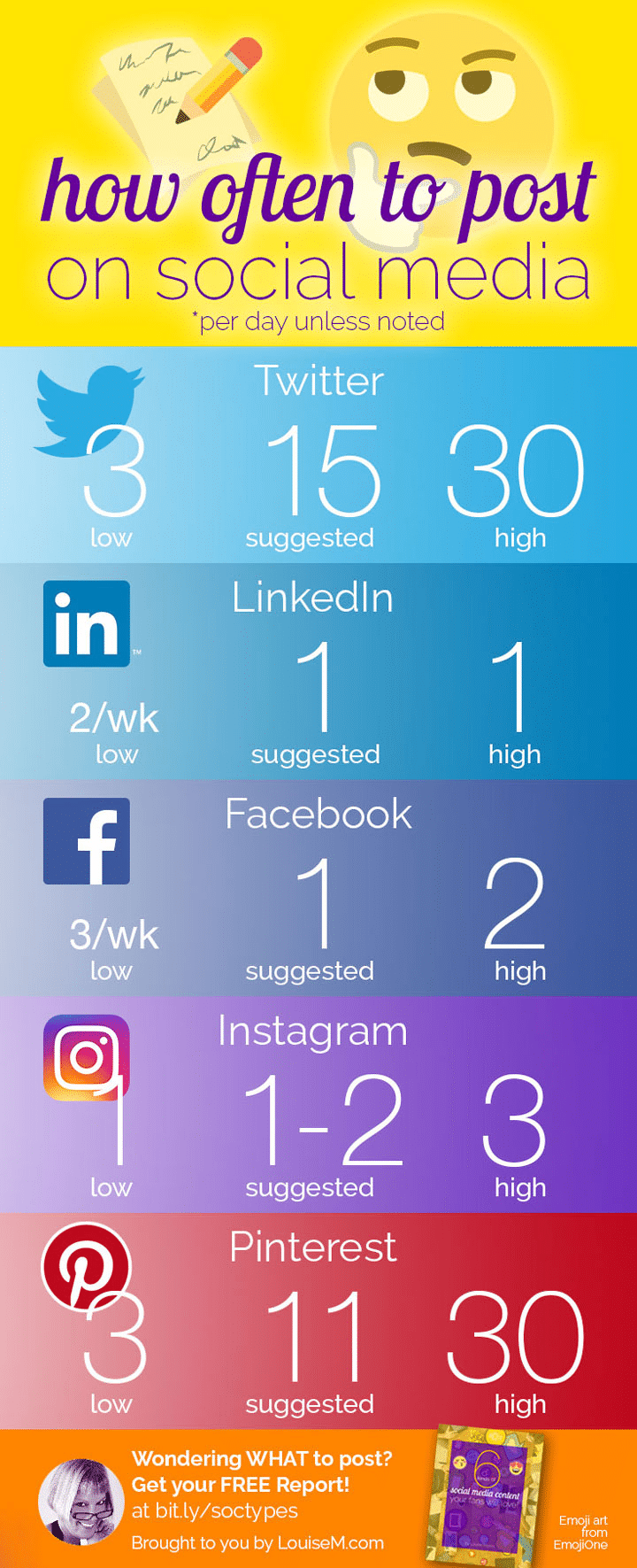 Her sosyal platformun ne sıklıkta paylaşım yapmanız gerektiğine dair kendi normları olduğunu bilmek önemlidir. Örneğin, Twitter her zaman yeşil kalan içerik için tasarlanmamıştır, bu nedenle daha sık paylaşım yapmak isteyeceksiniz. Ancak, Facebook sayfanıza günde on beş kez gönderi yayınlarsanız, bu çok fazla. Louise Myers'dan gelen bu bilgi grafiği, bakmak için bazı basketbol sahası figürleri veriyor. Bunlar kurallar veya kısıtlamalar değildir, ancak düşüncelerinizi bilgilendirmeye yardımcı olabilirler.