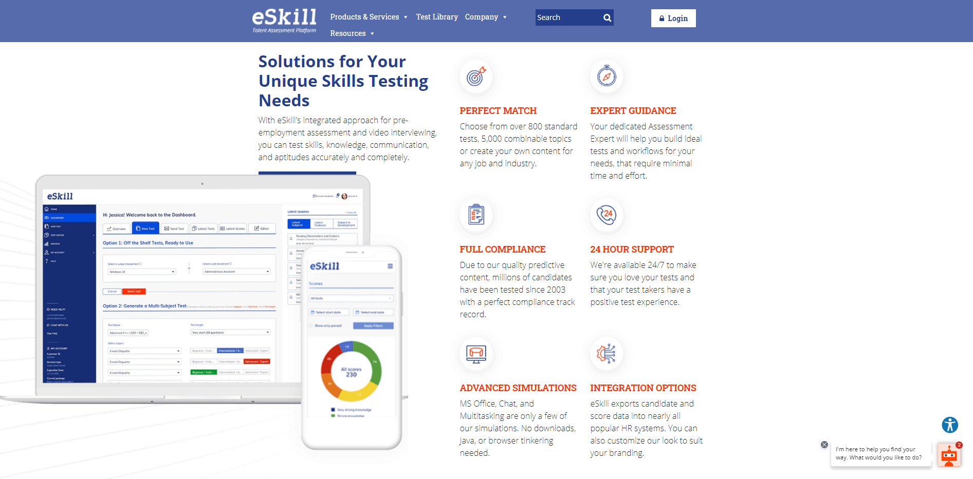 eSkill, eSkill yazarlarını özelleştirilmiş istihdam testi için de kullanabileceğiniz test kitaplığında 1.000'den fazla teste erişmenizi sağlar.