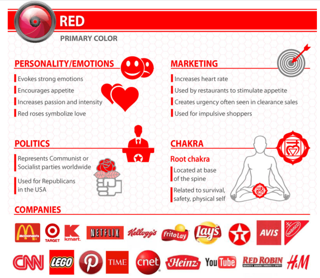 Örneğin kırmızı, bir şeyin aciliyet arz ettiğini ve oturmanız ve dikkat etmeniz gerektiğini gösterir. Sarı, güneşli veya neşeli bir şeyi gösterir. Bu, bir şirketin mutluluk, neşe ve neşe getiren bir ürünü olduğunu ifade eder. Paranın rengi olan yeşil, hem çevresel hem de fiziksel sağlığı ifade etmek için kullanılır. Turuncu hem sıcaklığı hem de dikkati ifade eder. Bir şeye dikkat etmek için uyarır, ancak yardımcı olan bir şeyi de iletebilir. Her bir renk ve önemi hakkında daha fazla bilgi için bu tam sayfa bilgi grafiğine göz atın.