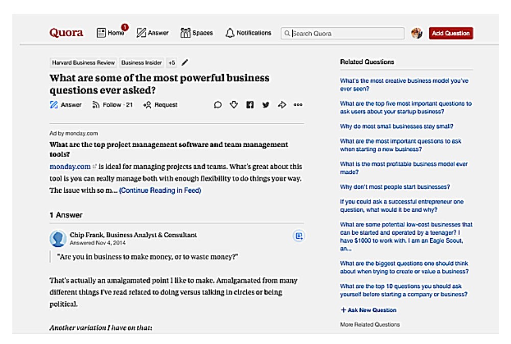 Gezegendeki en meraklı insanlar, en uzağa gidenler olma eğilimindedir. Bu nedenle ilgili soruları sormaktan asla korkmamalısınız. Çevrimiçi ve başka yerlerde bir şeyler başarmış diğer profesyonellerle konuşun. Sosyal medyaya yaklaşımları hakkında bilgi edinin. Onlara gönderi sürelerini, olumsuz yorumları, kalıcı müşterileri ve benzeri şeyleri nasıl ele aldıklarını sorun. Farklı alanların parçası olan insanların da size verecek içgörüleri olmadığını varsaymayın. Bir restoran sahibiyseniz, çamaşırhane veya giyim mağazası yöneten bir profesyonelden öğrendiklerinize şaşırabilirsiniz. İş iştir. İşte, işle ilgili sorularınız için Quora'yı kullanmanın harika bir örneği: