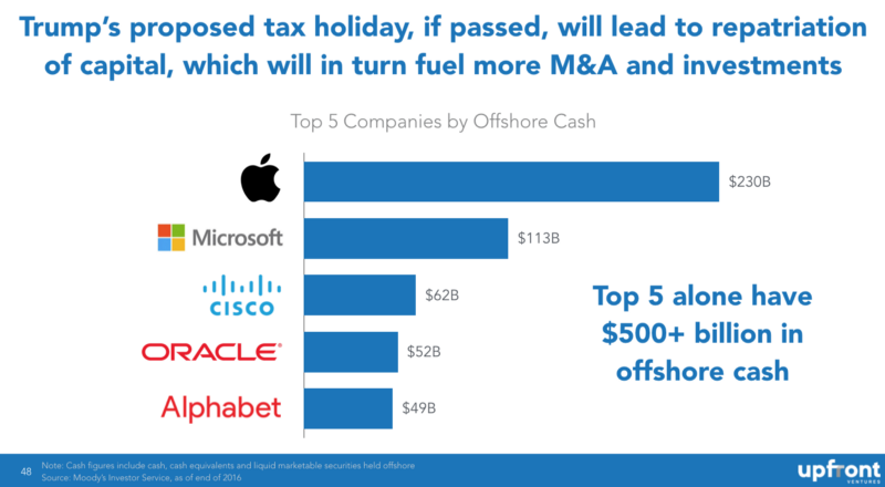 Ve bu yazar, Amerika Birleşik Devletleri'nin şu anki başkanı hakkında olumlu bir şey söylemeyi zor bulsa da, muhtemelen ABD teknoloji sektörüne fayda sağlayacak gibi görünen bir karar var - yabancıların ülkelerine geri dönüşünde vergi tatili. sermaye . Birçok teknoloji şirketi yurtdışında büyük karlar elde etti ve ABD'ye geri getirmenin bir vergisi olduğu için yurtdışında bırakıyorlar. ABD'nin en büyük 5 teknoloji firmasının yurtdışında oturan 500 milyar dolardan fazla nakde sahip olduğunu tahmin ediyoruz ve bu ABD'ye geri getirilirse artması muhtemel: Ar-Ge harcamaları, birleşme ve satın alma anlaşmaları ve risk sermayesi finansmanları.