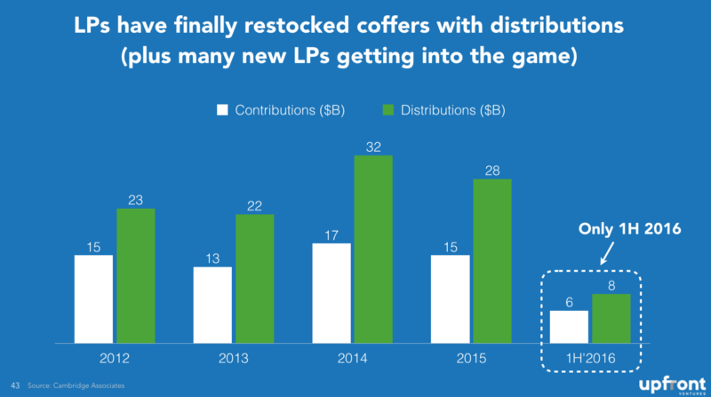Birleşme ve satın alma hikayesi geniş çapta rapor edilmiş olsa da, belki de çok daha az kişi, VC firmalarını finanse eden kişiler olan Sınırlı Ortakların (LP'ler) son dört yıl içinde dağıtımlarda kendilerine önemli ölçüde daha fazla para gelmesiyle kasalarını yeniden doldurabildiğini biliyor. VC firması yatırımlarını finanse etmek için sermaye çağrılarından daha fazla. Beni en çok bu tablo şaşırttı.