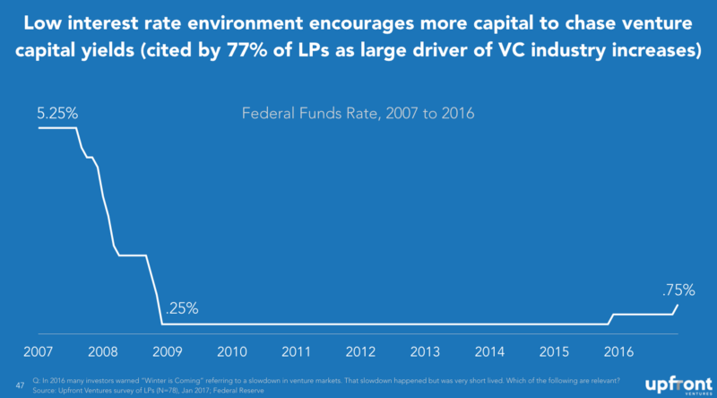 VC piyasalarını zorlamaya yardımcı olan büyük bir faktör, açıkçası, sürekli düşük faiz oranları göz önüne alındığında, diğer birçok varlık sınıfının varlık yöneticilerinin arzu ettiği getiri profillerine sahip olmaması ve anket yaptığımız LP'lerin ve VC'lerin %77'sinin bunun önemli olduğunu düşünmesidir. gelişen VC pazarlarına katkıda bulunuyor.
